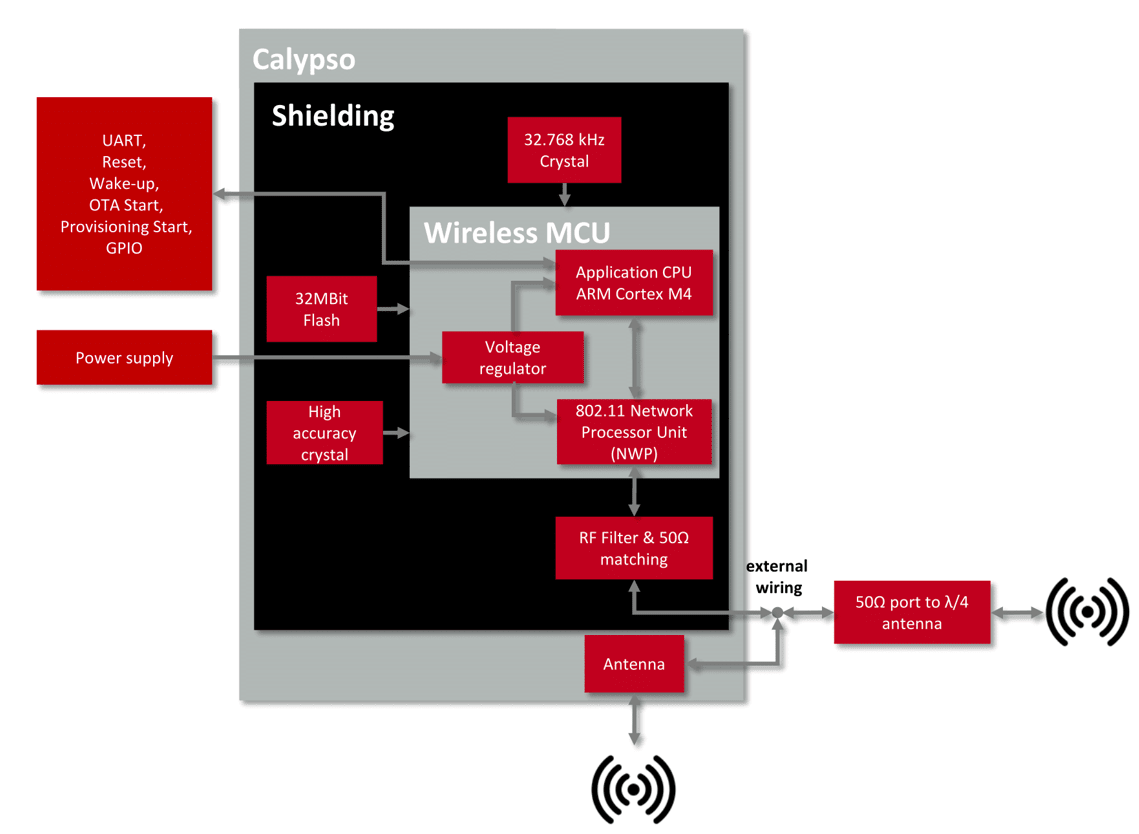 Figure 3: Combinations of two input pins set the start-up mode of the Calypso module. The intelligent antenna switch supports the use of an external antenna. (Source: Würth Elektronik)