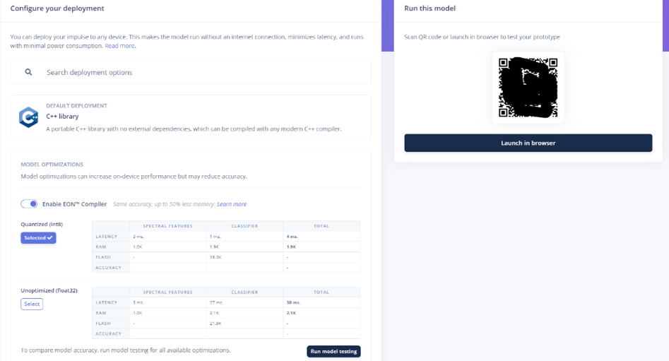 • WebAssembly Deployment: Edge Impulse supports deployment via WebAssembly for web-based applications. This means models can be run directly in browsers, making them accessible to a broad audience without platform-specific constraints.