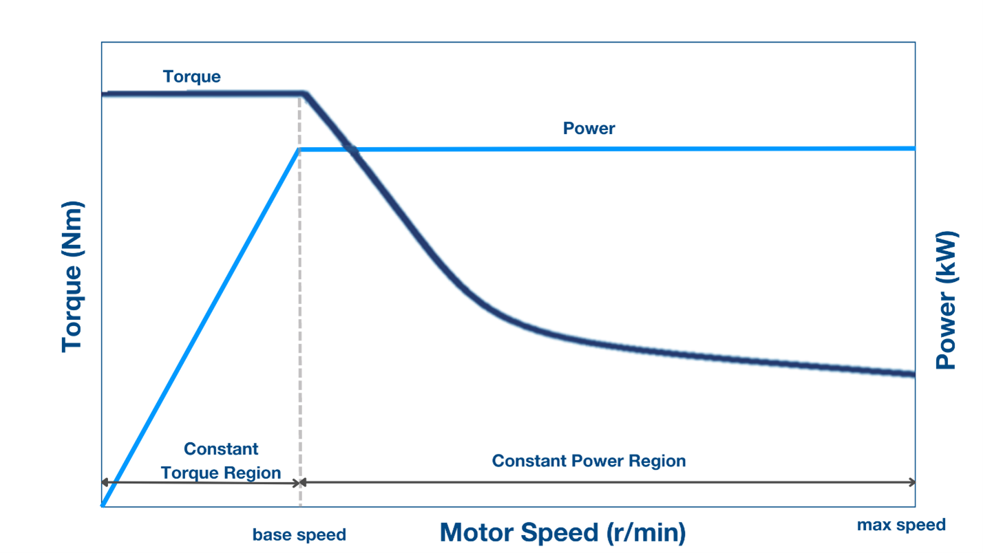 Figure 1: Traction motors can deliver high torque at low speed for start-up acceleration and low torque at high speeds. (Source: Hayrettin Gökozan;[1] redrawn by author)