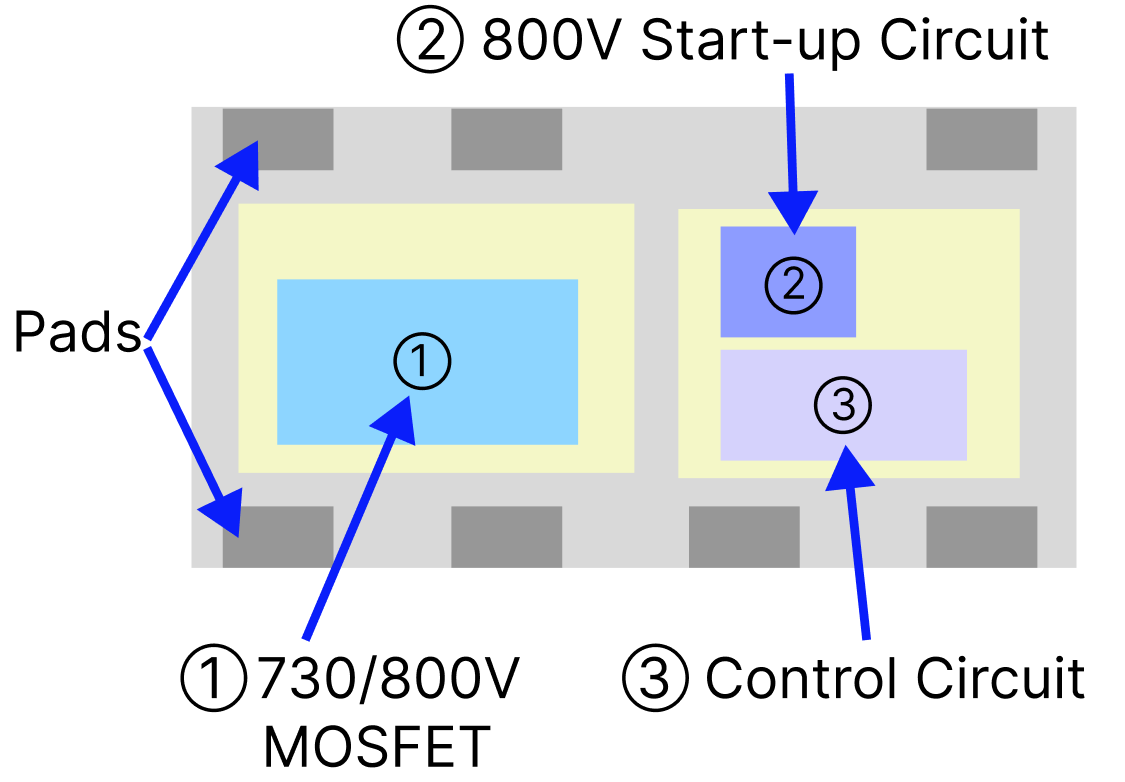 For designers looking to implement this solution, ROHM Semiconductor offers a variety of devices that prioritize efficiency, reliability, low standby power, and safety. These include silicon metal-oxide-semiconductor (Si-MOS) FETs rated at 730V and above. As shown in Figure 2, the internal architecture of the 730V/800V models separates the power MOSFET, startup circuit, and control circuit to provide high noise immunity.