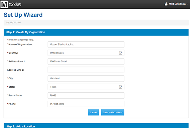 - Paso 1: Cree Mi organización: Rellene el formulario para facilitarnos información básica sobre su organización. Si esta información ya está guardada en su cuenta My Mouser, aparecerá automáticamente en el formulario.