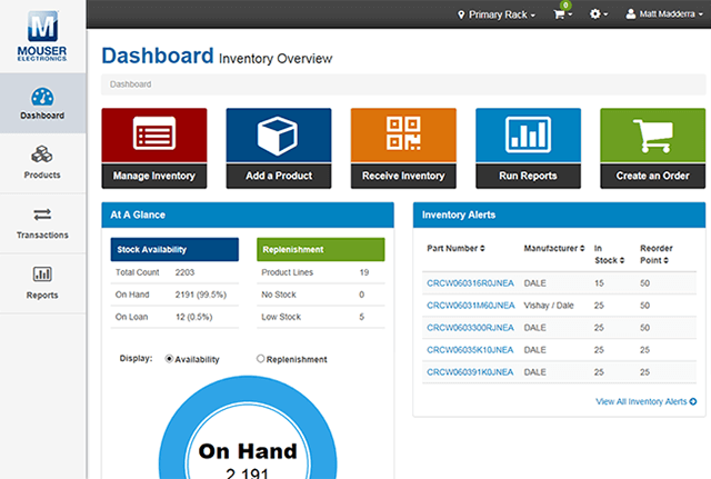 La plataforma de gestión de inventario de Mouser es un sistema en la web que permite a las organizaciones gestionar y hacer un seguimiento fácilmente de sus existencias locales de componentes electrónicos y suministros relacionados.