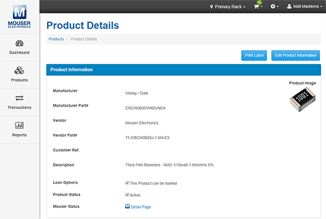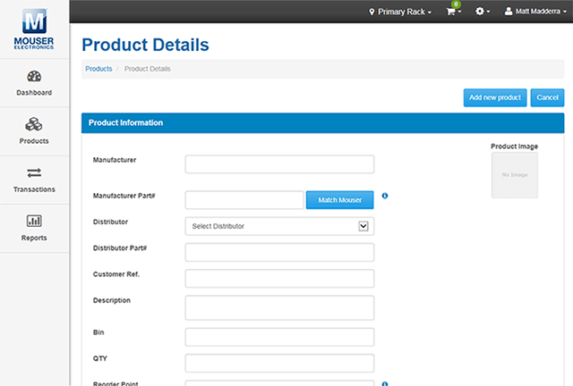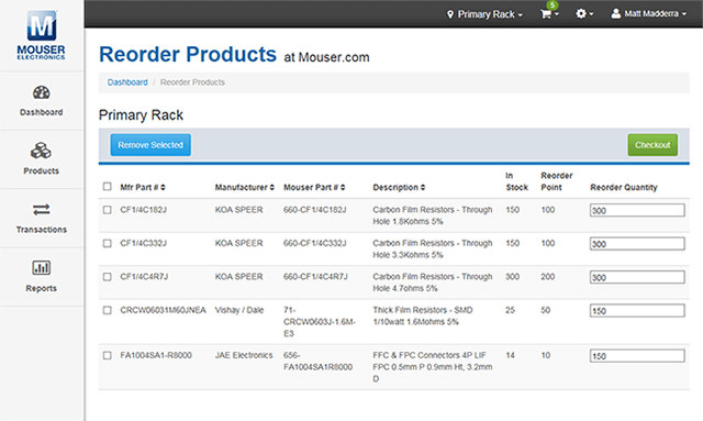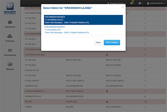 - Vinculación de los productos de su inventario a números de referencia de Mouser para facilitar la solicitud de nuevos pedidos