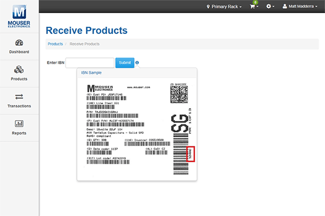 - Código de barras de la etiqueta Mouser: Se le dirigirá a un formulario especial en el que podrá introducir un código de la etiqueta de embalaje de Mouser para importar automáticamente los datos del producto.