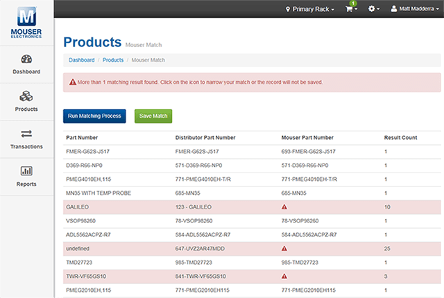 Al hacer clic en la opción Mouser Match en el menú «Más», podrá acceder a la pantalla de coincidencia de piezas. Cuando se encuentre en esta pantalla, podrá iniciar el proceso de coincidencia haciendo clic en el botón «Ejecutar proceso de coincidencias». A medida que se vayan encontrando piezas coincidentes, el número de posibles piezas coincidentes aparecerá en la columna de recuento de resultados. Cuando se obtenga una coincidencia exacta, las piezas se vincularán automáticamente y esas piezas desaparecerán de la pantalla. Al final del proceso, los únicos artículos que quedarán serán aquellas piezas para las que no se haya obtenido una coincidencia de forma automática. Estas piezas requieren que tome medidas antes de que se haga una coincidencia.