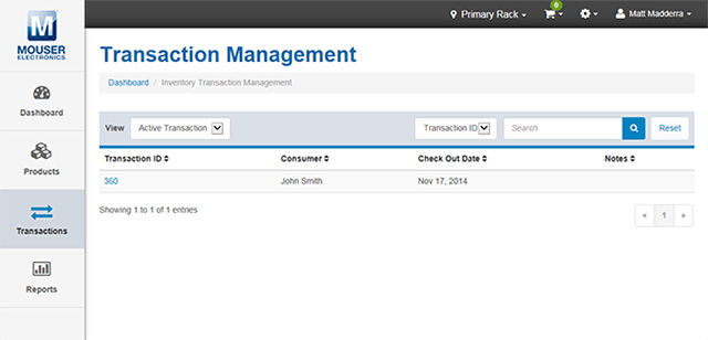 Se puede acceder a todo el historial de transacciones desde la pantalla «Gestión de transacciones». De forma predeterminada, se muestran las transacciones activas. Una transacción «activa» es una transacción que cuenta con piezas actualmente en préstamo. Puede cambiar la vista a «Historial de transacciones» para ver todas las transacciones.