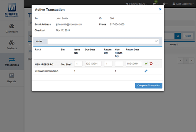 En la superposición de los detalles de las transacciones podrá realizar diferentes ediciones. Estos cambios pueden ser tan leves como añadir notas a la transacción, o tan importantes como la actualización de la cantidad de emisión o las fechas de vencimiento para devoluciones. También puede marcar una transacción activa como cerrada especificando las cantidades de devolución, la fecha de devolución y haciendo clic en el botón «Transacción completa».